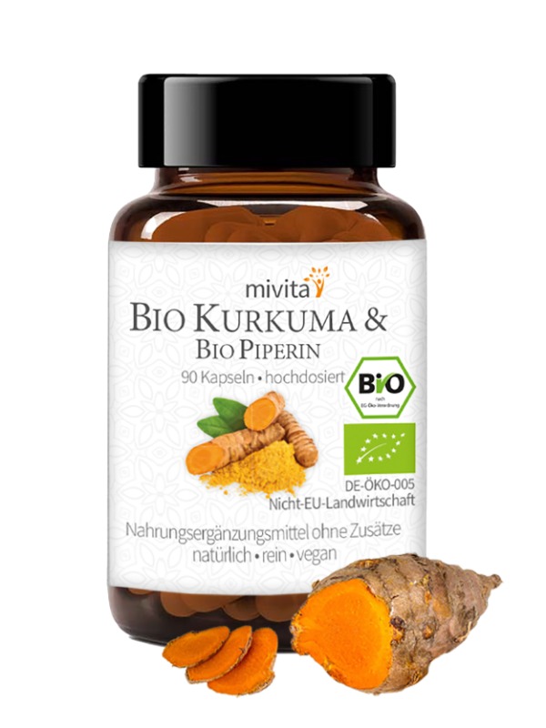 MIVITA Bio Kurkuma Kapseln mit besonders hohem Anteil an "Curcumin" plus Piperin, aus hochwertigem schwarzen Bio Pfeffer für eine deutlich bessere Aufnahme von Kurkuma im Körper. Dadurch erzielen wir die bestmögliche Bio Qualität. Piperin ist der Hauptbestandteil des schwarzen Pfeffers und in der Lage, die Bioverfügbarkeit bis um das 20-fache von Kurkuma zu erhöhen. In einer Studie des St. John's Medical College in Bangalore (Indien) wurde dies belegt. Quelle: PMID: 9619120c, Planta Med.1998 Mai; 64 (4): 353-6. •
